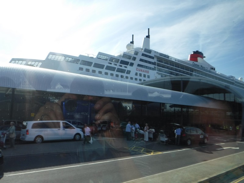 travers du vitrage, je prends le QM2 en photo de près et d’un peu plus loin. Le
